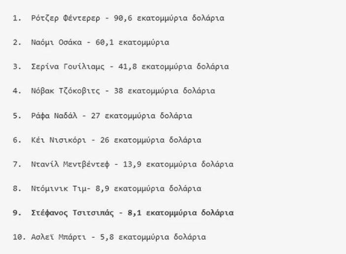 Οι 10 πιο ακριβοπληρωμένοι τενίστες, μεταξύ των οποίων βρίσκεται ο Στέφανος Τσιτσιπάς με 8,1 εκατομμύρια δολάρια (9η θέση), κέρδισαν συνολικά 320 εκατομμύρια δολάρια κατά τους τελευταίους 12 μήνες, ποσό μειωμένο κατά 6% σε σχέση με πέρυσι, σύμφωνα με το Forbes.