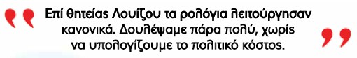 Επί θητείας Λουίζου ξεκινήσαμε να βάζουμε τάξη. Ενεργοποιήθηκαν και τοποθετήθηκαν ρολόγια περίπου στο 75% της έκτασης της Δημοτικής Ενότητας Μαραθώνα, τα οποία και λειτούργησαν κανονικά. Μάλιστα, γι’ αυτή την κίνηση κατηγορήθηκα κιόλας, παρόλο που, ως Αντιδήμαρχος τότε, εφάρμοσα απόφαση Δημοτικού Συμβουλίου. Μας ασκήθηκαν μεγάλες πιέσεις, αλλά δεν υποχωρήσαμε.