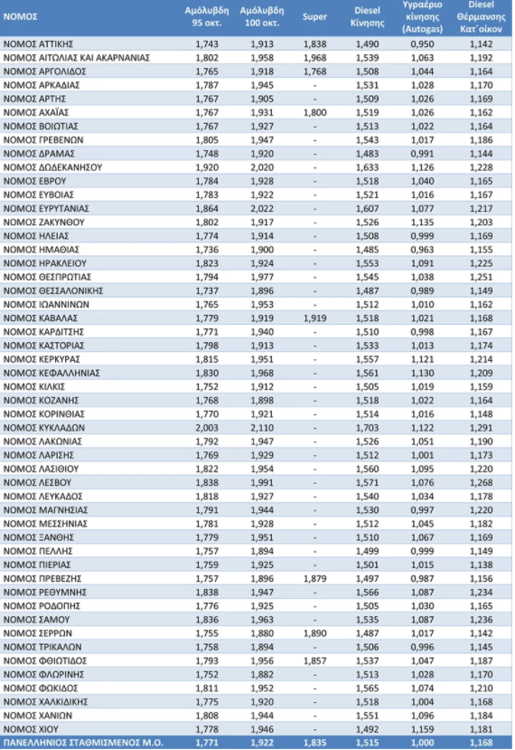 Πρωταθλητής στις αυξήσεις ο νομός Κυκλάδων με την αμόλυβδη στα 2 ευρώ και ακολουθεί ο νομός Δωδεκανήσων με 1,92 ευρώ το λίτρο. Από το κύμα ακρίβειας δεν γλιτώνουν ούτε όσοι χρησιμοποιούν πετρέλαιο κίνησης αφού στην Αττική ήδη έχει φτάσει τα 1,49 ευρώ το λίτρο.