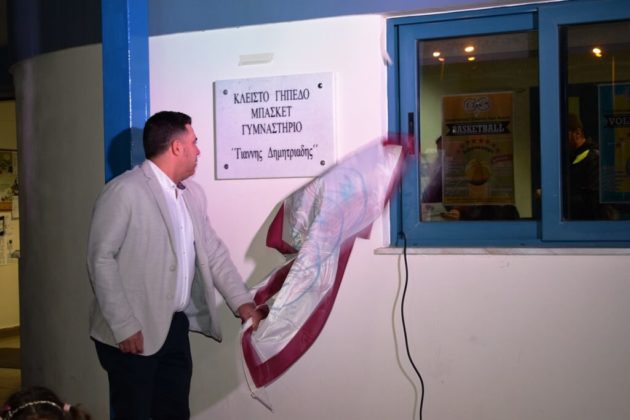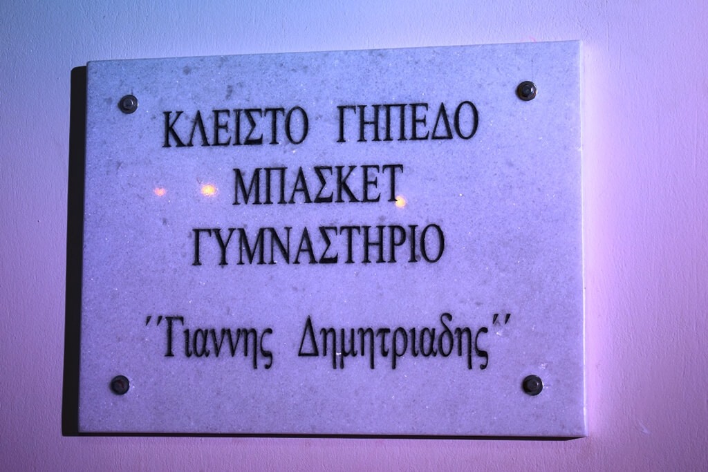 Η συγκίνηση κορυφώθηκε όταν με δάκρυα στα μάτια, ο Πρόεδρος του Συλλόγου Νίκος Καραβασίλης αποκάλυψε την μαρμάρινη επιγραφή που πλέον θα κοσμεί την είσοδο του Κλειστού Γηπέδου Μπάσκετ και θα αναφέρει: «Κλειστό Γήπεδο Μπάσκετ – Γυμναστήριο Γιάννης Δημητριάδης».