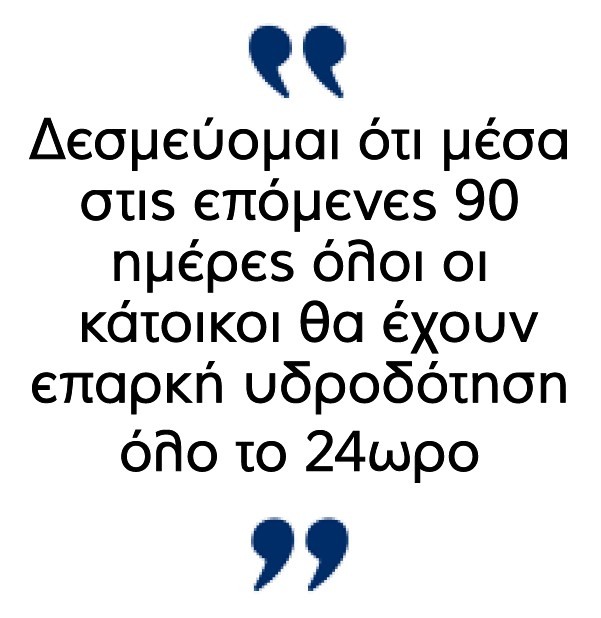 Συνεπώς, οι κάτοικοι αρκετών περιοχών που δεν έχουν νερό καθ’ όλη τη διάρκεια του 24ωρου ή έχουν πολύ χαμηλή πίεση, δικαιούνται να ζητούν κάτι καλύτερο και δεσμεύομαι ότι μέσα στις επόμενες 90 ημέρες θα έχουν επαρκή υδροδότηση όλο το 24ωρο.