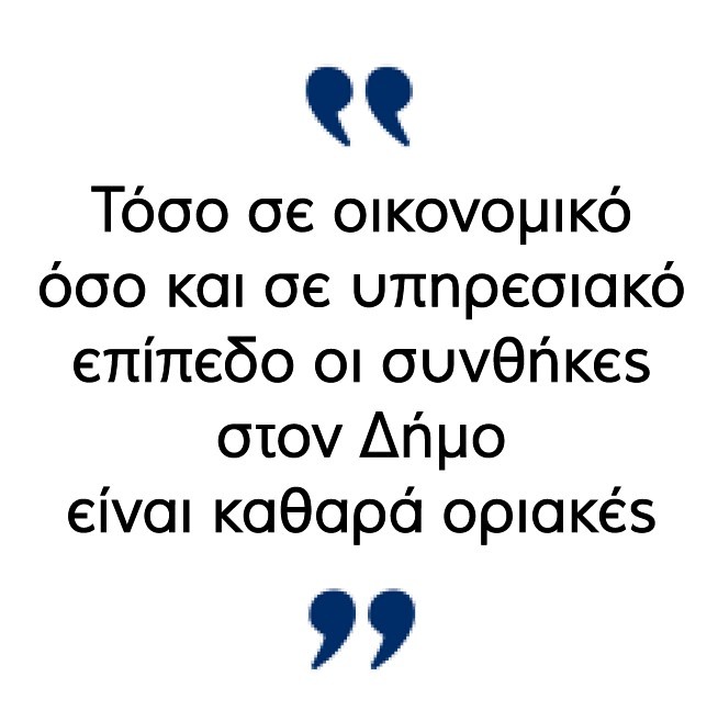 Τόσο σε οικονομικό όσο και σε υπηρεσιακό επίπεδο οι συνθήκες είναι καθαρά οριακές. Κρίση στις σχέσεις ανάμεσα σε υπαλλήλους και διευθύνσεις δίχως προγραμματισμό και δράσεις. Ευτυχώς, όμως, την επομένη μέρα της δεύτερης Κυριακής των εκλογών το κλίμα ισορρόπησε. Η διάθεση των υπαλλήλων άλλαξε. Μένει και οι νέοι Αντιδήμαρχοι να δείξουν ότι μπορούν να αντιμετωπίσουν την πρόκληση των 90 ημερών.