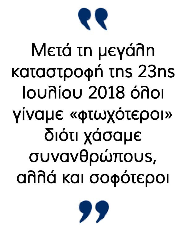 Μετά τη μεγάλη καταστροφή της 23ης Ιουλίου 2018 όλοι γίναμε «φτωχότεροι» διότι χάσαμε συνανθρώπους, αλλά και σοφότεροι. Σε συνεργασία με τους εμπλεκόμενους φορείς, υπάρχει εγκεκριμένο και επικαιροποιημένο σχέδιο Πολιτικής Προστασίας, ικανό να ανταποκριθεί στις σημερινές ανάγκες του Δήμου.