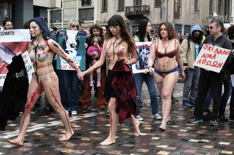 Η γυμνή διαμαρτυρία πραγματοποιήθηκε στο Μοναστηράκι από ακτιβιστές, οι οποίοι συγκεντρώθηκαν στην πλατεία κρατώντας πλακάτ με φωτογραφίες νεκρών ζώων.