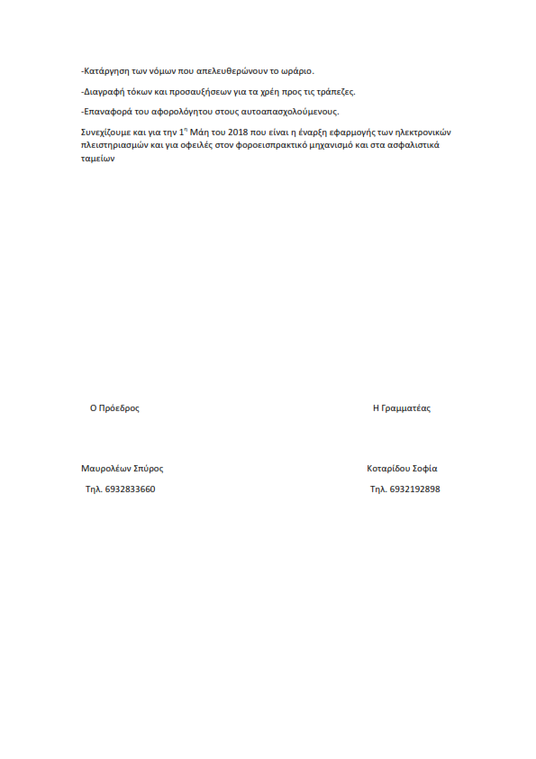 Οι δράσεις αυτές γίνονται από Ενώσεις ΕΒΕ, Εμπορικούς Συλλόγους, Ομοσπονδίες Επαγγελματιών, Εργατικά Σωματεία, Σωματεία Συνταξιούχων κι άλλους φορείς με συσκέψεις, παραστάσεις, παρεμβάσεις σε εφορία, ΕΦΚΑ κτλ.