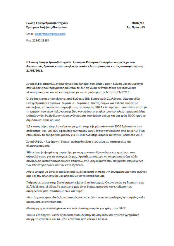 Η Ένωση Εμπόρων Ραφήνας κατά των ηλεκτρονικών πλειστηριασμών και των κατασχέσεωνΗ Ένωση Επαγγελματοβιοτέχνων Εμπόρων του Δήμου Ραφήνας Πικερμίου συμμετέχει στις δράσεις που πραγματοποιούνται στην ολόκληρη την Ελλάδα κατά των ηλεκτρονικών πλειστηριασμών και των κατασχέσεων.