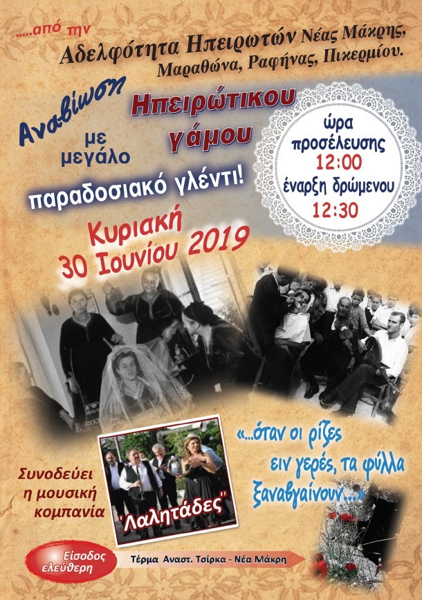 Πάντα με τη συντροφιά του κλαρίνου, οι Ηπειρώτες ακολουθούσαν πιστά μια ιεροτελεστία στους γάμους, την οποία έχουμε τη χαρά να παρακολουθήσουμε την Κυριακή 30 Ιουνίου 2019, στις 12 το μεσημέρι. Την αναβίωση του Ηπειρώτικου Γάμου διοργανώνει η Αδελφότητα Ηπειρωτών Νέας Μάκρης, Μαραθώνα, Ραφήνας, Πικερμίου.