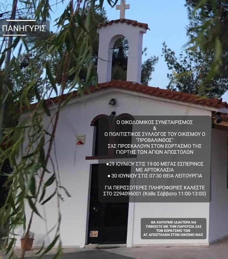Πανηγυρίζει το ερχόμενο Σάββατο 29 Ιουνίου ο Ιερός Ναός των Αγίων Αποστόλων στον Προβάλινθο και ο Οικοδομικός Συνεταιρισμός με τον Πολιτιστικό Σύλλογο του οικισμού «Ο Προβάλινθος», καλούν τους πιστούς στους εορτασμούς.