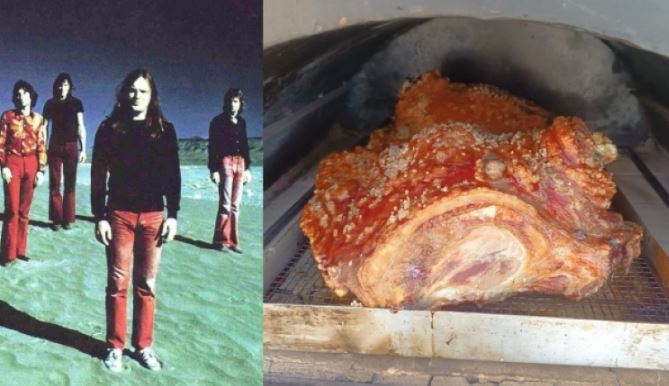 Τώρα πως συνδέονται οι Pink Floyd με τη γουρουνοπούλα; Για την ιστορία, προφανώς και οι διοργανωτές του πάρτι το συνδύασαν με το τεράστιο φουσκωτό γουρούνι που απελευθερώθηκε το 1976 στον ουρανό του Λονδίνου. Το όνομα του ήταν «Algie», είχε μήκος εννέα μέτρα και είχε κατασκευαστεί για τις ανάγκες της φωτογράφησης του άλμπουμ των Pink Floyd με τίτλο «Animals».