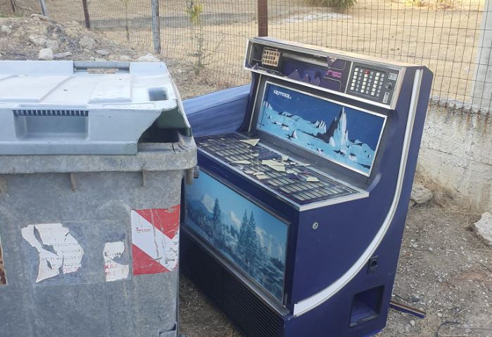 Ποιος ξέρει σε ποιο μαγαζί (;) θριάμβευσε αυτό το τζουκ μποξ, μέχρι να έρθει η μέρα που βρέθηκε και φωτογραφήθηκε στα αζήτητα, δίπλα σε έναν κάδο σκουπιδιών.