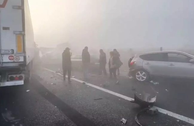 Στο σημείο από τις πρώτες πρωινές ώρες υπάρχει πυκνή ομίχλη, η οποία δυσχέρανε την ορατότητα των οδηγών με αποτέλεσμα να σημειωθεί η σύγκρουση. Βίντεο από το σημείο της σύγκρουσης δείχνει ότι έχουν εμπλακεί και φορτηγά, ενώ ορισμένα από τα οχήματα έχουν υποστεί σοβαρές ζημιές.