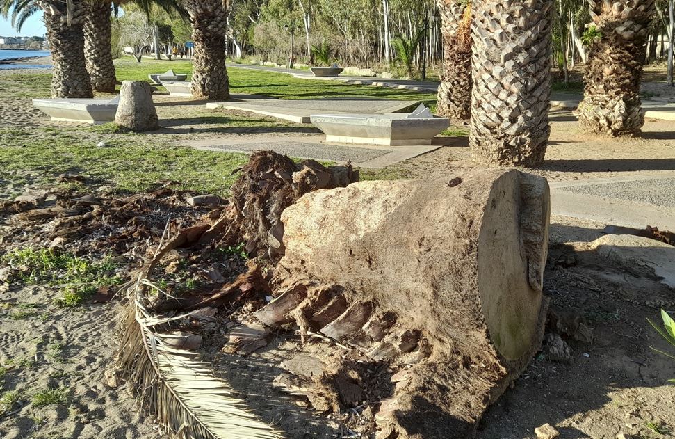 Στις άλλες φωτογραφίες βλέπουμε φοίνικες κομμένους και παρατημένους ή ξεραμένους και όρθιους, παλούκια από πρώην ομπρέλες και φανοστάτες σκουριασμένοι έτοιμοι να καταρρεύσουν γιατί τα χρήματα για την αγορά των νέων φανοστατών-οδοντογλυφίδων δεν έφτασαν για να αντικατασταθούν όλοι.
