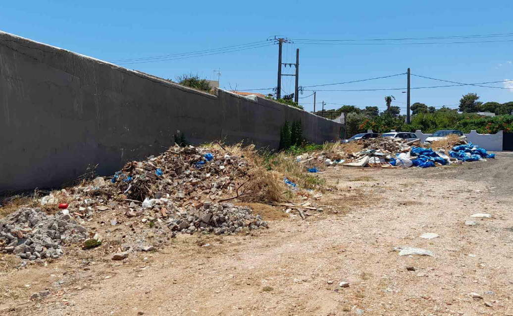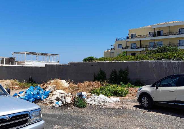 Κάποιοι – και όχι από το ξενοδοχείο – που προφανώς βαριούνται να πετάξουν τα σκουπίδια τους στους κάδους, έχουν βρει την εύκολη λύση και τα εναποθέτουν στο οικόπεδο δημιουργώντας αυτή την εικόνα που βλέπετε στις φωτογραφίες.