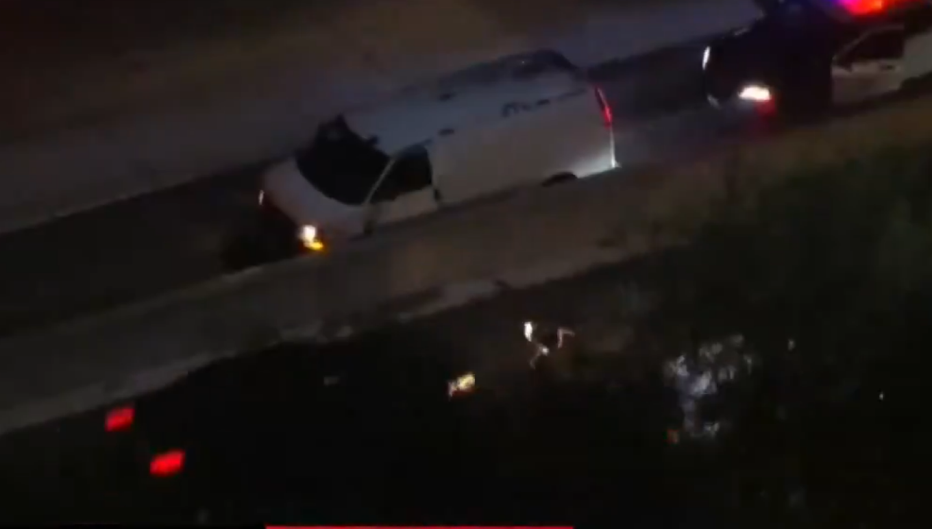 Στο βίντεο από το CBS Los Angeles φαίνεται ο αγνώστων στοιχείων άνδρας να κατεβαίνει από το λευκό φορτηγάκι που είχε κλέψει νωρίτερα τη Δευτέρα στην Τσάιναταουν ενώ ήταν σε αυτοκινητόδρομο.