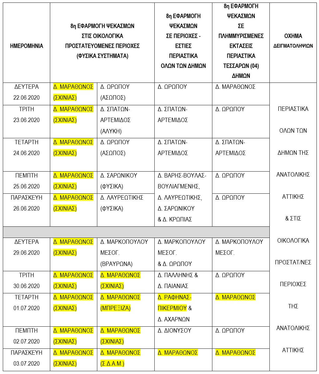 Η Διεύθυνση Υγειονομικού Ελέγχου και Περιβαλλοντικής Υγιεινής της Περιφερειακής Ενότητας Ανατολικής Αττικής, ως υπεύθυνη εφαρμογής του προγράμματος καταπολέμησης κουνουπιών για το έτος 2020, υπό την καθοδήγηση του Αντιπεριφερειάρχη Ανατολικής Αττικής, συνεχίζει με τον 8ο Κύκλο Εφαρμογών Ψεκασμών των Κουνουπιών (προνυμφοκτονιών) από εδάφους, από Δευτέρα 22 Ιουνίου ως εξής: