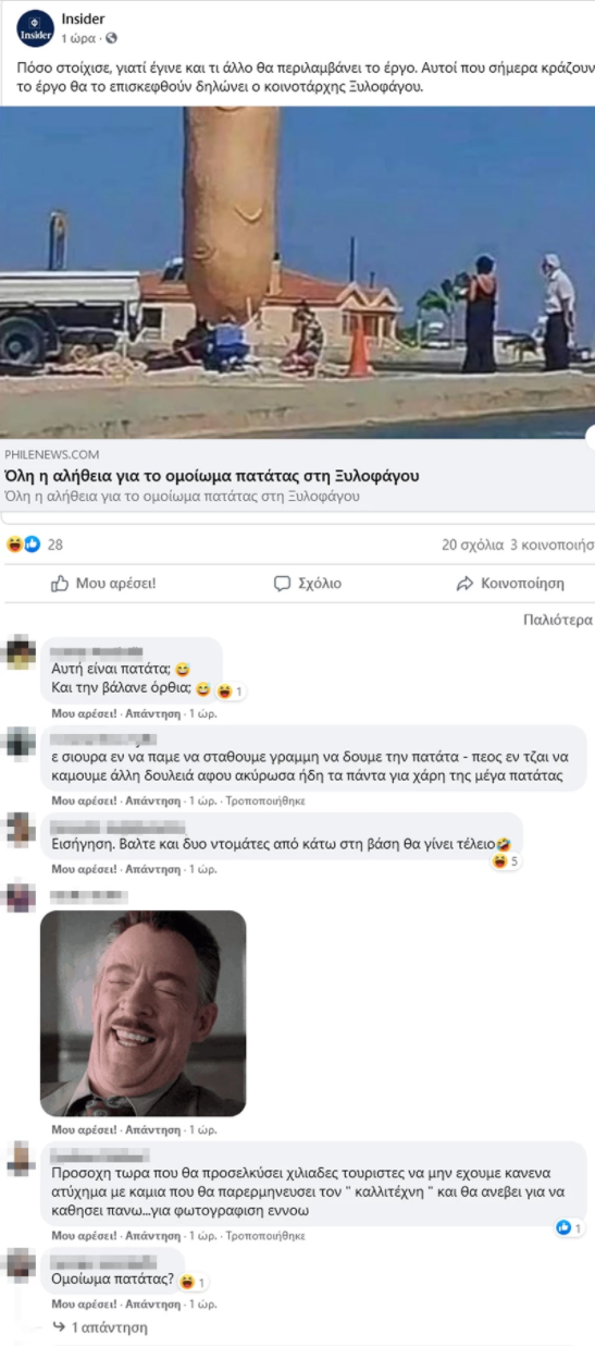 Ποικίλες αντιδράσεις προκάλεσε στην Κύπρο και συγκεκριμένα στην κοινότητα Ξυλοφάγου ένα ομοίωμα πατάτας. Το Insider του Φιλελεύθερου επικοινώνησε με τον κοινοτάρχη Γεώργιο (Κόκο) Τάσσου, ο οποίος ήταν και ο εμπνευστής του έργου.