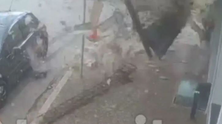 Είναι η στιγμή που το καταρρέει το μπαλκόνι στο Λαύριο. Μια γυναίκα, η οποία στεκόταν κάτω από αυτό μιλάει ανυποψίαστη στο κινητό της. Έχει αφήσει στο έδαφος μια σακούλα και δεν μπορεί να φανταστεί τι θα ακολουθήσει.