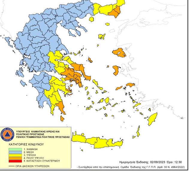 Πολύ υψηλός κίνδυνος πυρκαγιάς (κατηγορία κινδύνου 4) προβλέπεται την Κυριακήγια πέντε περιφέρειες της χώρας, σύμφωνα με το Χάρτη Πρόβλεψης Κινδύνου Πυρκαγιάς που εκδίδει η γενική γραμματεία Πολιτικής Προστασίας του υπουργείου Κλιματικής Κρίσης και Πολιτικής Προστασίας (civilprotection.gov.gr).