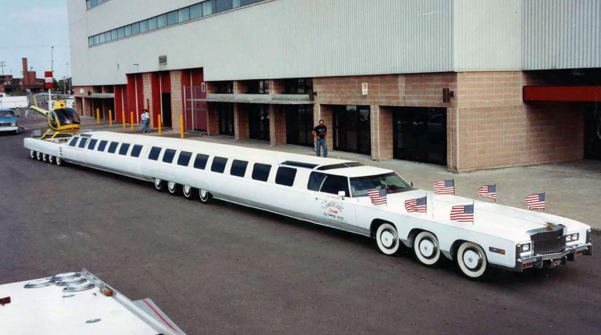 Το Αμερικανικό Όνειρο πραγματώθηκε το 1986 στην πόλη Μπέρμπανγκ της Καλιφόρνια, δια χειρός του μηχανικού-θρύλου Jay Ohrberg. Έχοντας ως βάση της μια Cadillac Eldorado η θεόρατη λιμουζίνα αρχικέ έφτανε τα 18,28 μέτρα, “καθόταν” σε 26 τροχούς, και αντλούσε κίνηση από ένα ζεύγος V8 κινητήρων, τοποθετημένους στο μπροστινό και πίσω μέρος.