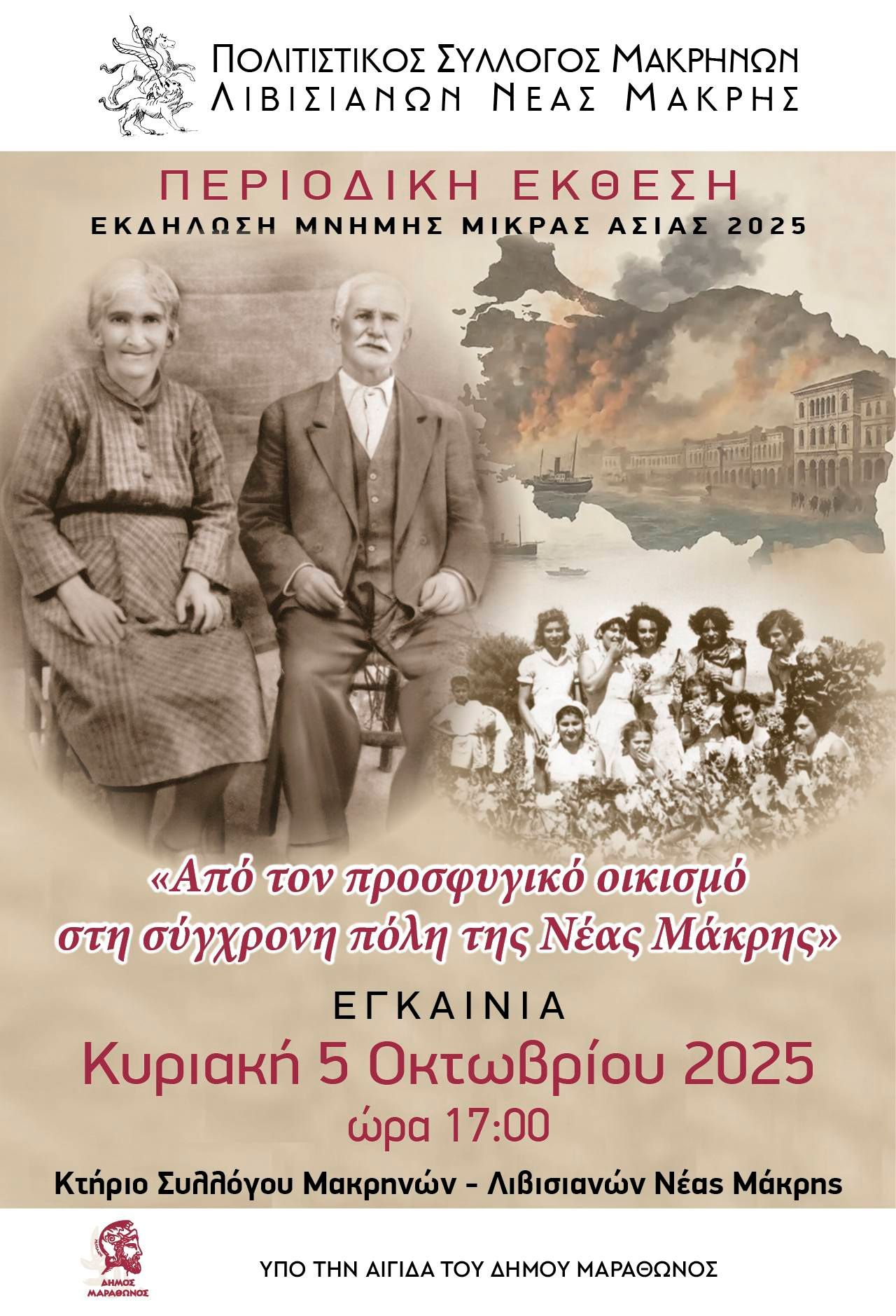 «Από τον προσφυγικό οικισµό στη σύγχρονη πόλη της Νέας Μάκρης». Μια Έκθεση που αποτυπώνει, µέσα από φωτογραφικό υλικό και προσωπικά αντικείµενα, την πορεία και τη βιωµένη εµπειρία των προσφύγων που ήρθαν από τη Μάκρη και το Λιβίσι. Αξίζει πραγµατικά να την επισκεφθείτε, στο Κτήριο του Συλλόγου Μακρηνών – Λιβισιανών Νέας Μάκρης.
