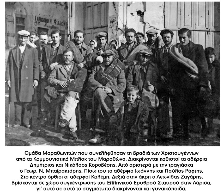 Την επόμενη μέρα, ημέρα των Χριστουγέννων, κρυφάκουγα συνομιλίες της μάνας μου και του πατριού ότι τα πράγματα σήμερα είναι πολύ δύσκολα, όπως του εμπιστεύθηκε ο Καπετάν Μελέτης. Πράγματι, θυμάμαι χαρακτηριστικά ότι εκείνη την εποχή είδα μια μεγάλη ομάδα ανθρώπων από το μπαλκόνι του σπιτιού μου που βάδιζαν πεζή στον δρόμο προς Γραμματικό, οι οποίοι ήταν Μαραθωνίτες που είχαν συλληφθεί ως όμηροι και τους οδηγούσαν προς άγνωστο μέρος τρεις οπλισμένοι αντάρτες, έφιπποι. Οι συλληφθέντες Μαραθωνίτες είχαν υποδειχθεί από ντόπιους «ρουφιανοχαφιέδες» που είχαν ενταχθεί στο «Φρουραρχείο» Στρατηγείο των ανταρτών στον Μαραθώνα, που το διοικούσε ο Καπετάν Αστέρης Γούσης από τη Λαμία. Θα αναφερθώ στο όνομα όσων έχω συγκρατήσει στη μνήμη μου από τις μετέπειτα συζητήσεις. Ολόκληρη η οικογένεια του μπάρμπα-Σαράντη Τσιμήνη, μαζί με τη γυναίκα του, τις δύο κόρες του και τους δύο γιους του. Λένε ότι κάποιος εγκάθετος είχε κτηματικές διαφορές μαζί τους και τους «κάρφωσε», οπότε και συνελήφθησαν.
