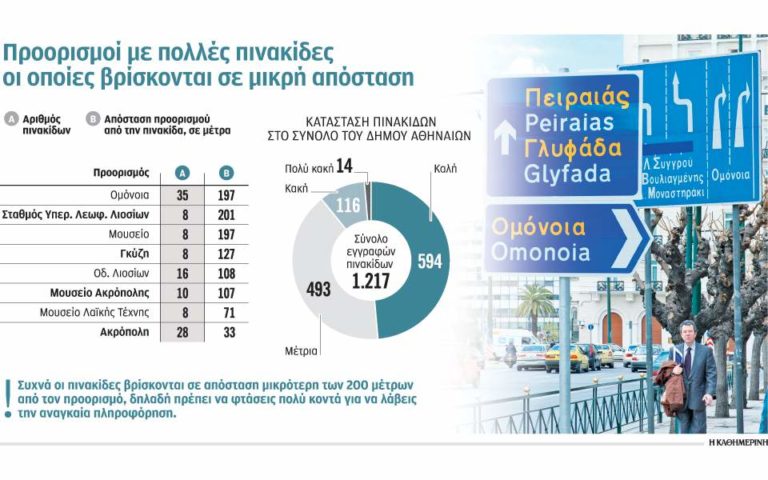 Σύμφωνα με την έρευνα, οι περιοχές με τα υψηλότερα ποσοστά κακών και πολύ κακών πινακίδων είναι: η περιοχή γύρω από τη συμβολή των οδών Βασιλίσσης Ολγας και Βασιλίσσης Αμαλίας, η περιοχή που οριοθετείται βόρεια από την οδ. Αλεξάνδρας, νότια από την οδ. Παλιγγενεσίας, δυτικά από την οδ. Φαναριωτών και ανατολικά από την οδ. Κόνιαρη, η περιοχή που οριοθετείται βόρεια από την οδ. Ιουλιανού, νότια από την οδ. Στουρνάρη, δυτικά από την οδ. Αχαρνών και ανατολικά από την οδ. Πατησίων.