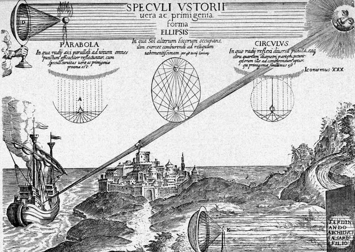 Ο Αρχιμήδης λέγεται ότι χρησιμοποίησε μια σειρά από καθρέφτες κατά μήκος του κόλπου για να κατευθύνει το ηλιακό φως στα εχθρικά πλοία που πλησίαζαν, βάζοντάς τα φωτιά.
