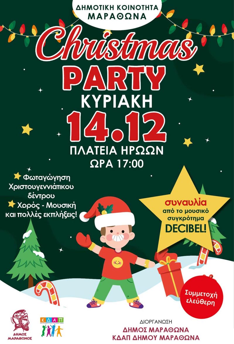 Η Δημοτική Κοινότητα Μαραθώνα και ο Δήμος Μαραθώνα σε συνεργασία με τα ΚΔΑΠ Δήμου Μαραθώνα διοργανώνουν μια μεγάλη χριστουγεννιάτικη γιορτή, γεμάτη φως, μουσική και εκπλήξεις, για να καλωσορίσουν τις πιο όμορφες μέρες του χρόνου.