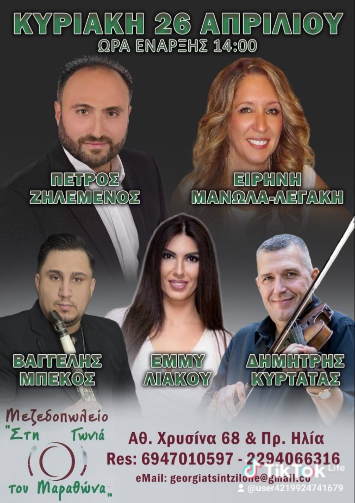 Εσείς βάζετε τη διάθεση, το κέφι και την όρεξη για φαγητό, ποτό και… πολύ χορό και εμείς βάζουμε την ορχήστρα που θα αποτελείται από τους Πέτρο Ζηλεμένο, Ειρήνη Μανώλη – Λεγάκη, Βαγγέλη Μπέκο, Έμμυ Λιάκου και Δημήτρη Κυρτάτα.
