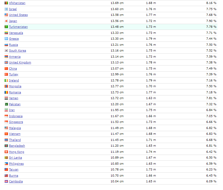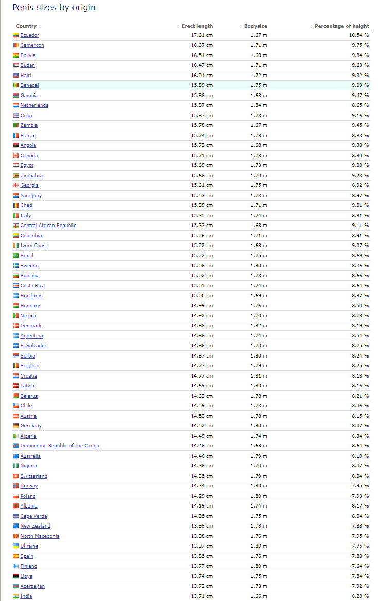 Στην δεκάδα, πέρα από την αναμενόμενη Αφρική, συναντάμε επίσης την Ολλανδία (15,87) και την Κούβα, ακριβώς στα ίδια εκατοστά. Ενδιαφέρον είναι ότι ο πίνακας συγκρίνει και τον μέσο όρο ύψους, καταλήγοντας έτσι σε μια αναλογία πέους προς μέγεθος σώματος. Έτσι, καθότι οι Ολλανδοί είναι ψηλότεροι (1,84 κατά μέσο όρο) το ποσοστό αυτό βγαίνει στο 8,65% ενώ το αντίστοιχο των Κουβανών είναι 9,16%, καθώς ο μέσος όρος ύψους είναι μόλις 1,73.