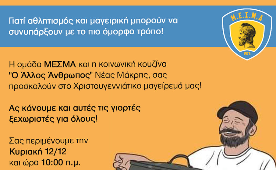 Όπως ανακοινώθηκε την Τετάρτη από τους εθελοντές της κουζίνας, την ερχόμενη Κυριακή 12 Δεκεμβρίου και ώρα θα πραγματοποιηθεί γιορτινό μαγείρεμα σε συνεργασία με τον ΜΕΣΜΑ στο Γυμνάσιο του Μαραθώνα.