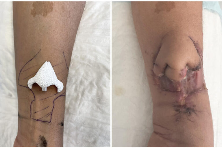 Μετά από δύο μήνες, οι χειρουργοί συνέδεσαν τα αιμοφόρα αγγεία του βραχίονα με τα αγγεία του προσώπου και μεταμόσχευσαν με επιτυχία τη μύτη, κατά τη διάρκεια μιας εξάωρης μικροχειρουργικής επέμβασης.