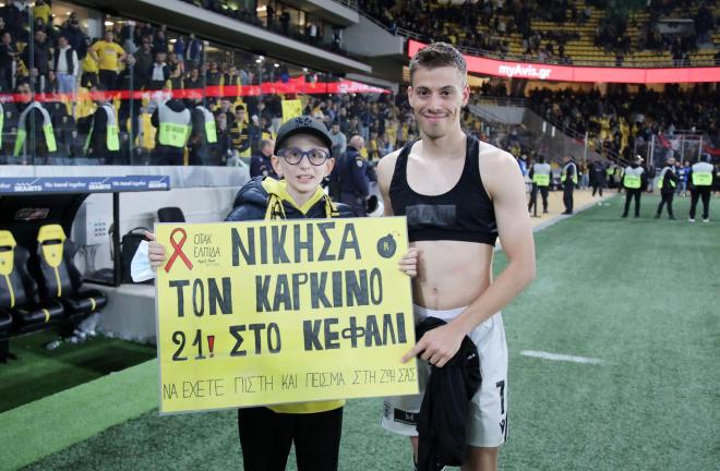 Τότε, οι ποδοσφαιριστές Γιάννης Κωνσταντέλιας και Σταύρος Πήλιος τον είχαν αγκαλιάσει και του είχαν προσφέρει τις φανέλες τους, σε μια κίνηση που είχε συγκινήσει τους φιλάθλους.