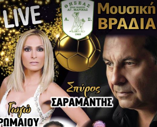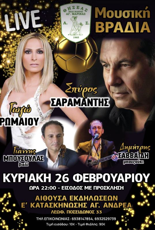 Μουσική βραδιά με λαϊκούς καλλιτέχνες διοργανώνει την Κυριακή 26 Φεβρουαρίου ο Θησέας Αγίας Μαρίνας.