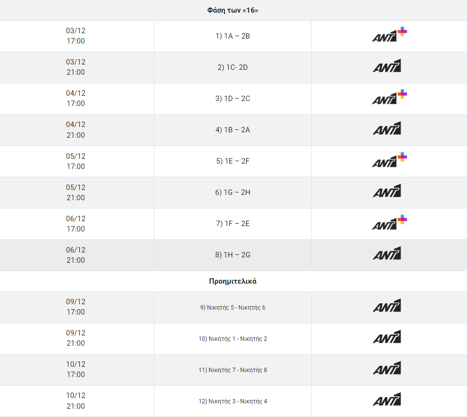 O ANT1+ θα μεταδώσει όλα τα παιχνίδια που θα διεξαχθούν στις 12:00 και στις 15:00, θα έχει πολλά παιχνίδια από τη φάση των ομίλων (28 μεταδόσεις), όπως και τέσσερις απογευματινούς αγώνες (17:00) στη φάση των «16».