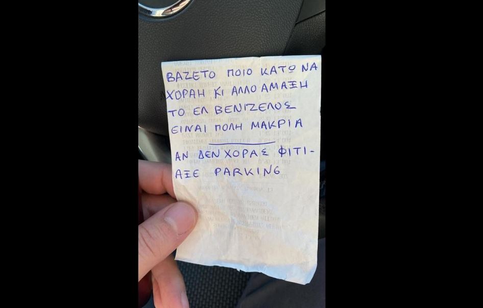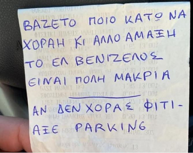 Με μια γραφή που παραπέμπει στην… ελληνική γλώσσα θέλησε κάποιος να βάλει στη θέση του τον ιδιοκτήτη ενός σταθμευμένου οχήματος.