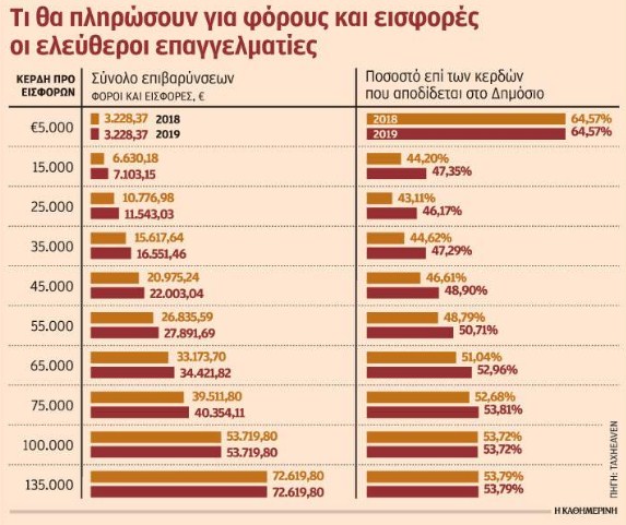 Στον αντίποδα, ελεύθερος επαγγελματίας με 10.000 ευρώ κέρδη το 2017 πλήρωσε εισφορές 2.695 ευρώ. Με την παραδοχή ότι θα διατηρήσει το ίδιο ποσό ως εισόδημα προ εισφορών και το 2018, θα κληθεί να καταβάλει εισφορές της τάξης των 2.900 ευρώ, αυξημένες κατά 7,9%. Το 2019, δε, θα καταβάλει εισφορές της τάξης των 3.421 ευρώ, αυξημένες κατά 26,95% σε σχέση με το 2017.