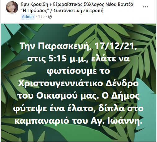 Αύριο Παρασκευή 17/12, οι κάτοικοι του Νέου Βουτζά θα «φωτίσουν» το χριστουγεννιάτικο έλατο που τοποθετήθηκε και φέτος δίπλα στην Εκκλησία του Αγίου Ιωάννη.
