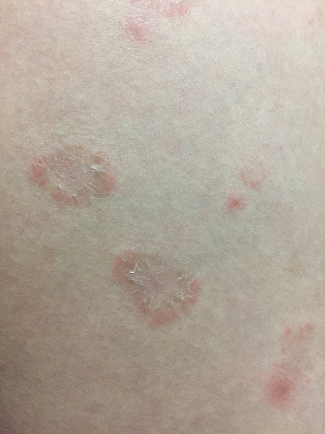Τα συμπτώματα είναι κυρίως στρογγυλά εξανθήματα ροζ χρώματος και μεγέθους 2 – 3 cm κυρίως στο θώρακα, την κοιλιά, και σε μικρότερο βαθμό στα χέρια, στα πόδια, στο λαιμό και στην πλάτη.