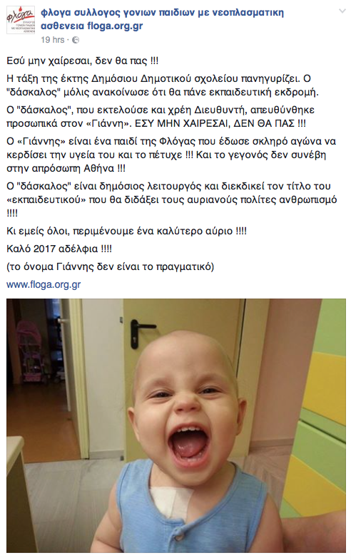 Σύμφωνα με καταγγελία που ανήρτησε ο Σύλλογος Γονέων Παιδιών με νεοπλασματική ασθένεια «Φλόγα», στην επίσημη σελίδα του στο facebook, ο δάσκαλος μίλησε με απαράδεκτο τρόπο στο παιδάκι το οποίο είναι νικητής στη σκληρή μάχη με τον καρκίνο.