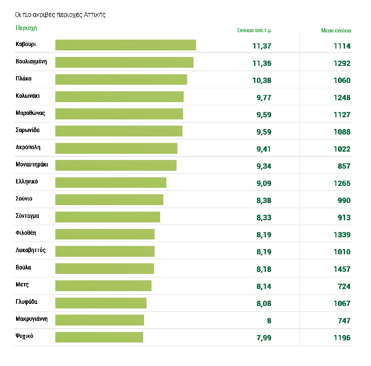 Από την άλλη στη λίστα με τις πιο ακριβές περιοχές βρίσκονται τα Νοτιοανατολικά Προάστια της Αττικής που αποτελούν και την Αθηναϊκή Ριβιέρα αλλά και μέρη του κέντρου της Αθήνας όπως το Σύνταγμα, η Πλάκα και το Κολωνάκι. Αμέσως μετά το Κολωνάκι, στην 5η θέση δηλαδή, βρίσκεται ο Μαραθώνας (9,59€/τμ). Πρωταθλητές αναδεικνύονται το Καβούρι (11,37€/τμ) αλλά και η υπόλοιπη Βουλιαγμένη (11,35€/τμ). Την τριάδα των πιο ακριβών περιοχών συμπληρώνει η Πλάκα (10,38€/τμ).