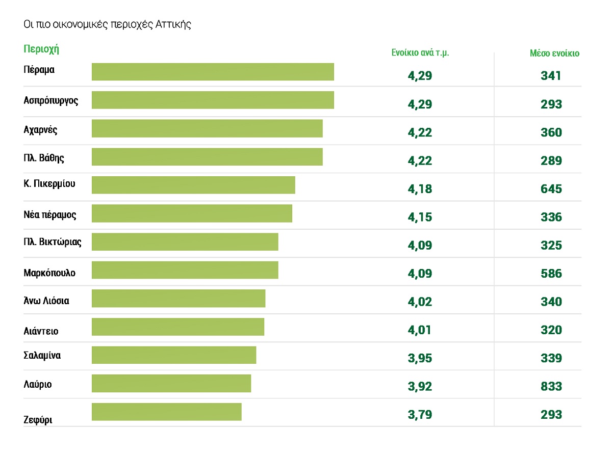 Πιο φθηνά είναι τα ενοίκια στην Δυτική Αττική αν και από τις χαμηλότερες θέσεις δεν λείπουν και οι υποβαθμισμένες περιοχές του κέντρου της Αθήνας. Με βάση την τιμή ενοικίου ανά τετραγωνικό πιο φθηνή περιοχή της Αττικής είναι το Ζεφύρι (3,79€/τμ) και ακολουθούν το Λαύριο (3,92€/τμ) και η Σαλαμίνα (3,95€/τμ). Εξαιρετικά χαμηλές είναι οι τιμές και στην Πλατεία Βάθης (4,22€/τμ) και τη Πλατεία Βικτωρίας (4,09€/τμ).