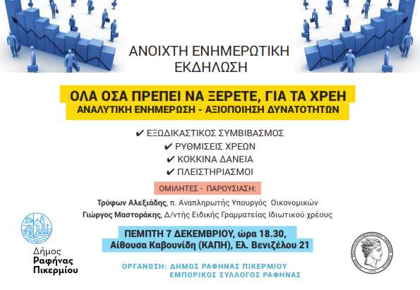 Ανοιχτή ενημερωτική εκδήλωση, με θέμα «Όλα όσα πρέπει να γνωρίζετε για τα χρέη», συνδιοργανώνουν ο Δήμος Ραφήνας-Πικερμίου με τον Εμπορικό Σύλλογο Ραφήνας με σκοπό την ενημέρωση των πολιτών για: