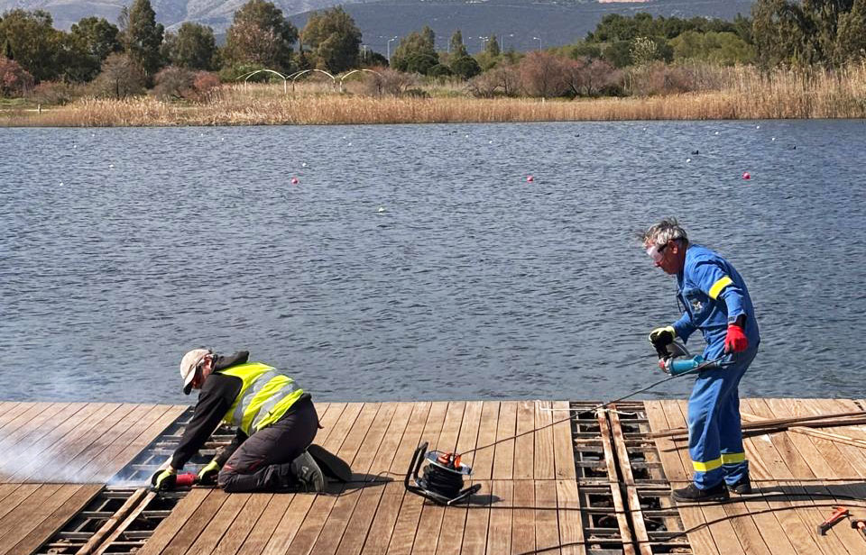 Οι επεμβάσεις ξεκίνησαν πριν από λίγους μήνες. «Ο στίβος καθαρίστηκε από τα καλάμια και τυχόν ζημιές αποκαταστάθηκαν και με τη βοήθεια δυτών. Επίσης επισκευάστηκαν οι πλωτές εξέδρες και οι εξέδρες των θεατών. Ετσι η εγκατάσταση έγινε και πάλι λειτουργική και πλέον προπονείται εκεί η εθνική ομάδα (σ.σ. ενόψει των Ολυμπιακών Αγώνων στο Λος Αντζελες το 2028).