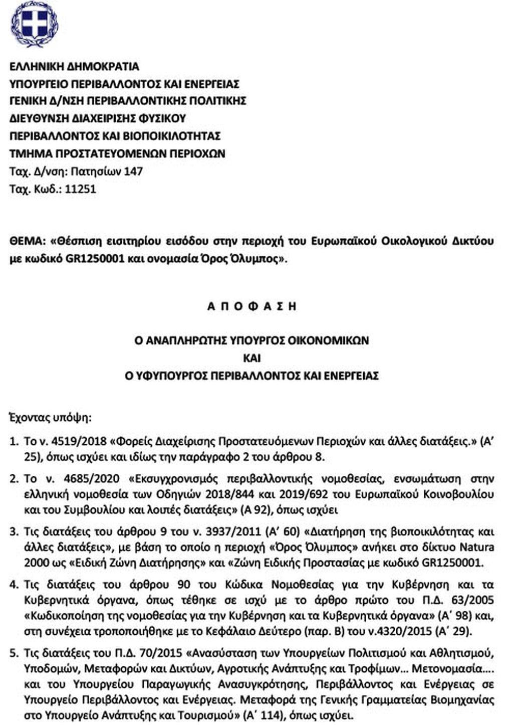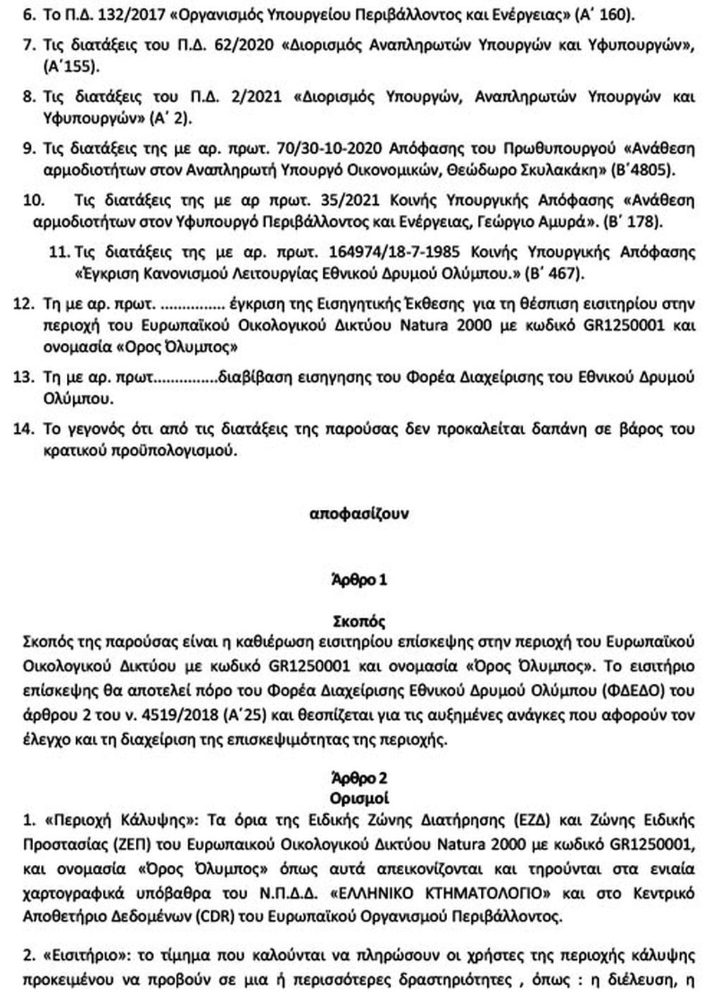 Η απόφαση, η οποία δεν έχει δημοσιευθεί ακόμα στη «ΔΙΑΥΓΕΙΑ» και συνεπώς το περιεχόμενό της δεν είναι οριστικό, ορίζει ξεκάθαρα στο πρώτο άρθρο της ότι καθιερώνεται εισιτήριο επίσκεψης «στην περιοχή του Ευρωπαϊκού Οικολογικού Δικτύου με κωδικό GR1250001 και ονομασία «Όρος Όλυμπος».
