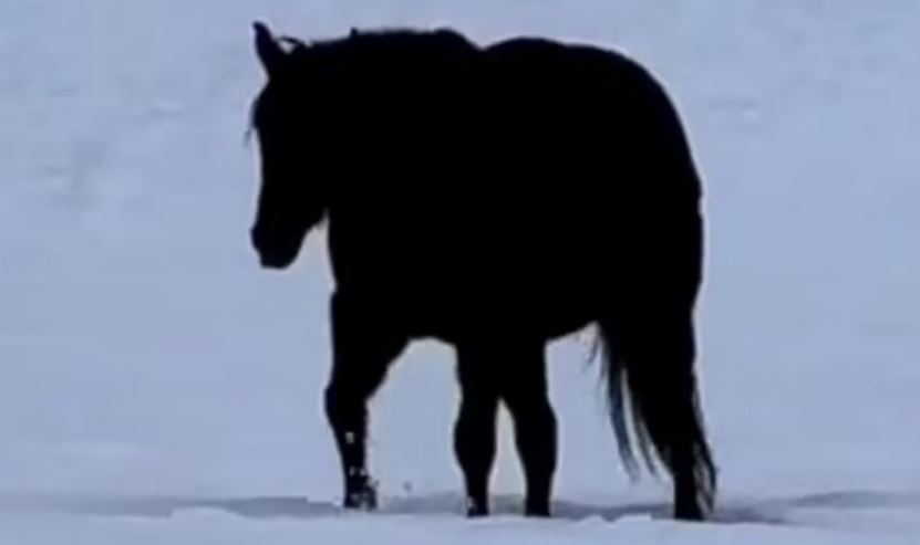 Όπως γράφει στο βίντεο η Αλεσία, το άλογό της έδειχνε «τόσο μαύρο στο χιόνι που δεν μπορείς να καταλάβεις εάν περπατάει προς το μέρος σου ή μακριά σου».