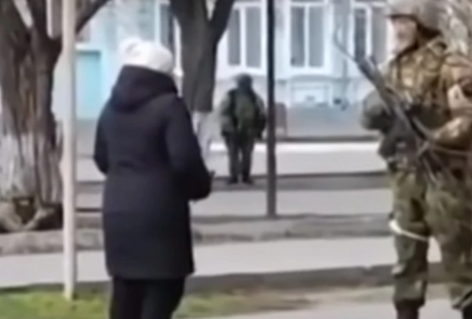Συγκινεί το βίντεο που κάνει τον γύρο του διαδικτύου τις τελευταίες ώρες με μια γενναία Ουκρανή γυναίκα να αντιμετωπίζει οπλισμένους Ρώσους στρατιώτες που εισέβαλαν στη χώρα από τα ξημερώματα της Πέμπτης.