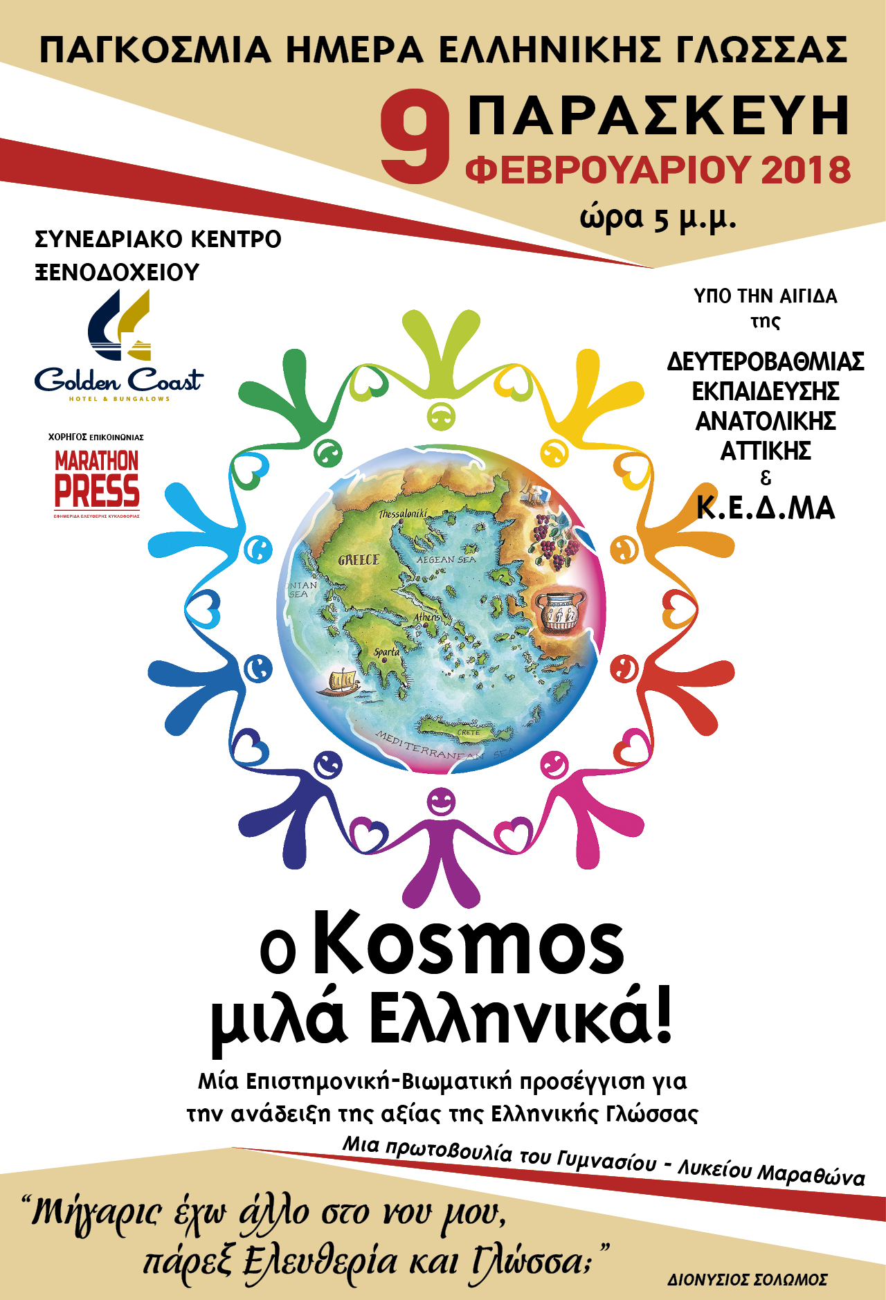 Το Γυμνάσιο & Λύκειο του Μαραθώνα γιορτάζουν την «Παγκόσμια Ημέρα Ελληνικής Γλώσσας» που έχει καθιερωθεί την 9η Φεβρουαρίου προς τιμή του Διονυσίου Σολωμού (8 Απριλίου 1798 – 9 Φεβρουαρίου 1857).