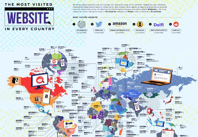 Τα στοιχεία της Hostinger δείχνουν ότι η πρώτη σε επισκέψεις ιστοσελίδα, μετά από αυτούς τους τρεις κολοσσούς του ίντερνετ, είναι η Wikipedia. Για την ακρίβεια, είναι Νο1 σε 43 χώρες του κόσμου, μεταξύ αυτών το Αφγανιστάν, η Αυστραλία, το Μπαγκλαντές, η Γαλλία, η Γερμανία, η Ινδία, η Ιταλία, το Πακιστάν, το Περού, η Σουηδία, η Ουγκάντα και η Ουκρανία.