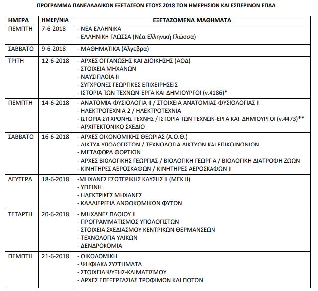 - Την Τρίτη 12-6-2018 στο μάθημα ΙΣΤΟΡΙΑ ΤΩΝ ΤΕΧΝΩΝ-ΕΡΓΑ ΚΑΙ ΔΗΜΙΟΥΡΓΟΙ εξετάζονται α) οι μαθητές/-τριες της Δ΄ τάξης εσπερινών ΕΠΑ.Λ σχ. έτους 2017-2018 και β) οι απόφοιτοι/-ες της Δ΄ τάξης εσπερινών ΕΠΑ.Λ. παρελθόντων ετών που διεκδικούν το ειδικό ποσοστό 1% επιπλέον των εισακτέων στην Τριτοβάθμια Εκπαίδευση (ΜΟΝΟ για ΤΕΙ, ΑΣΠΑΙΤΕ, ΑΣΤΕ, ΑΕΝ).